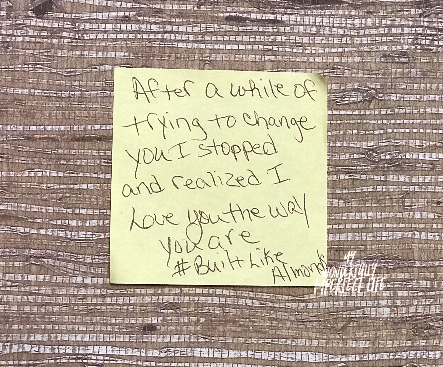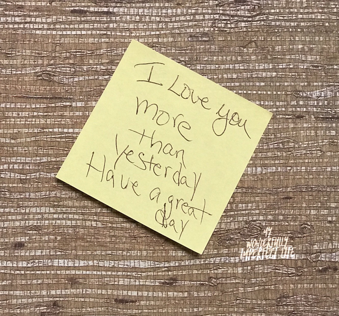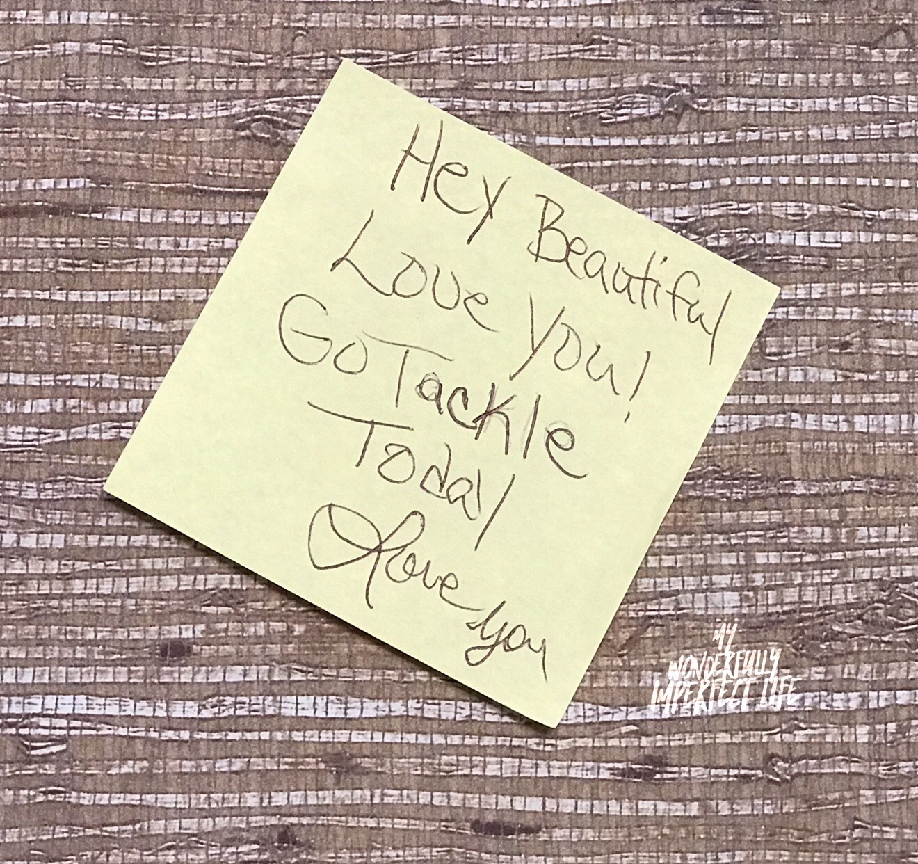 Post it notes! They were so sweet and encouraging. These may not seem like anything significant to some people but to me they are. And it’s moments like that when I am thankful for my husband knowing me and understanding me so well. Like I mentioned last night in our Wonderfully Imperfect Families Facebook Group, I’m a visual person. For me things have to be converted from abstract onto paper. I need to see it, touch it, feel it – in order for it to be real. And when you combine that with my reigning Love Language in this season- Words of Affirmation, and the fact that I think mornings suck, you can see why I ADORE these post-it notes from my husband each morning.